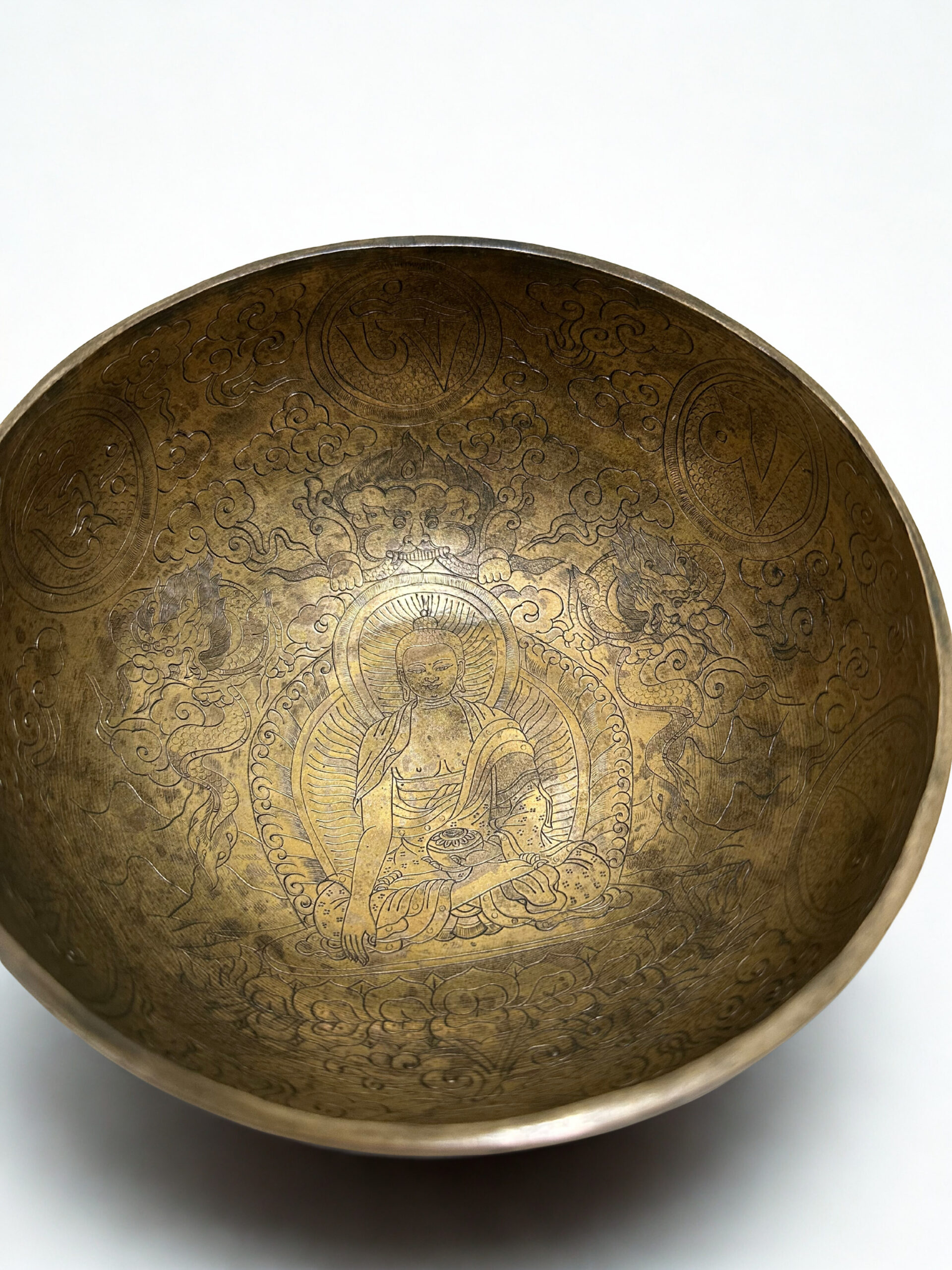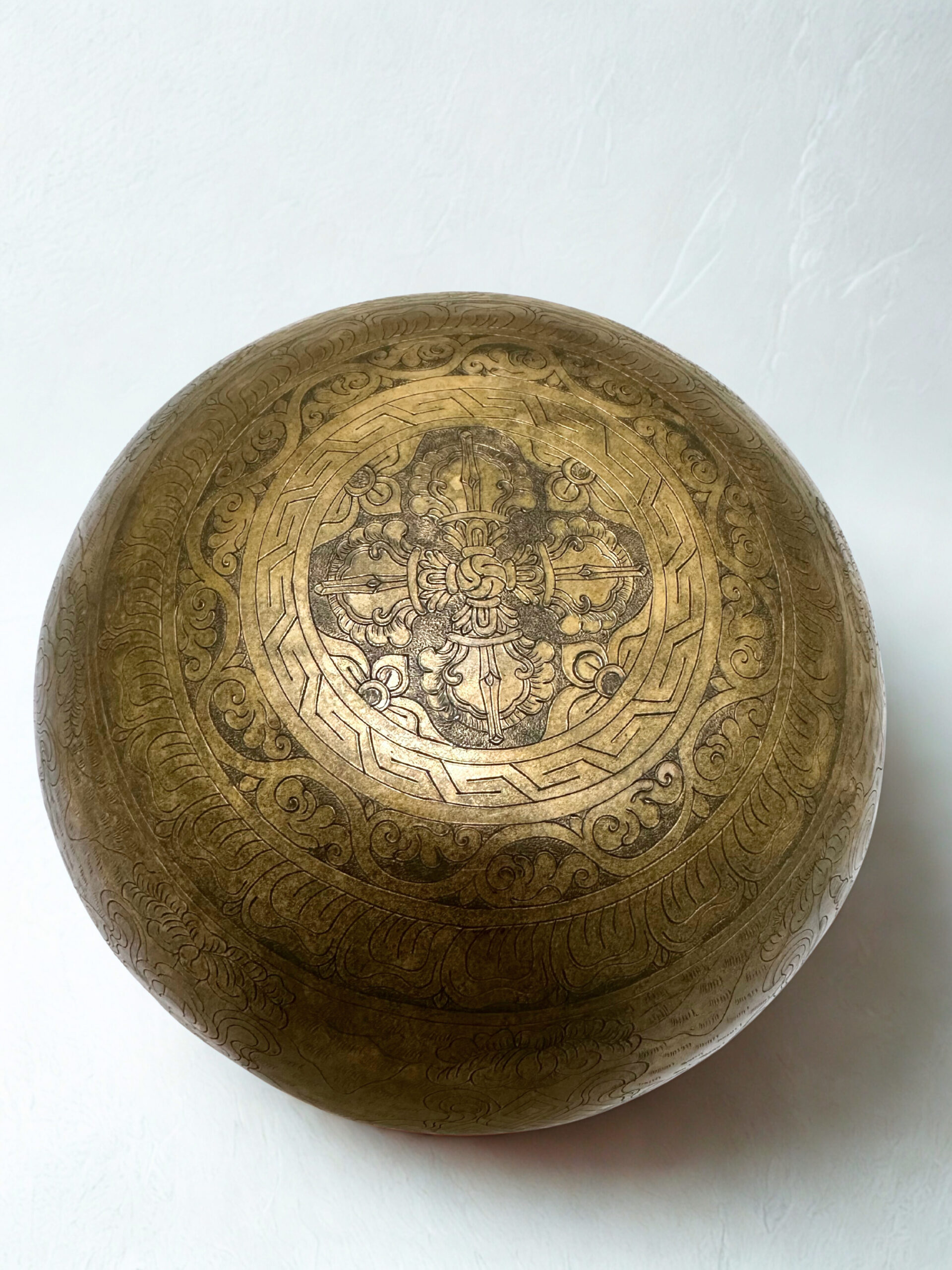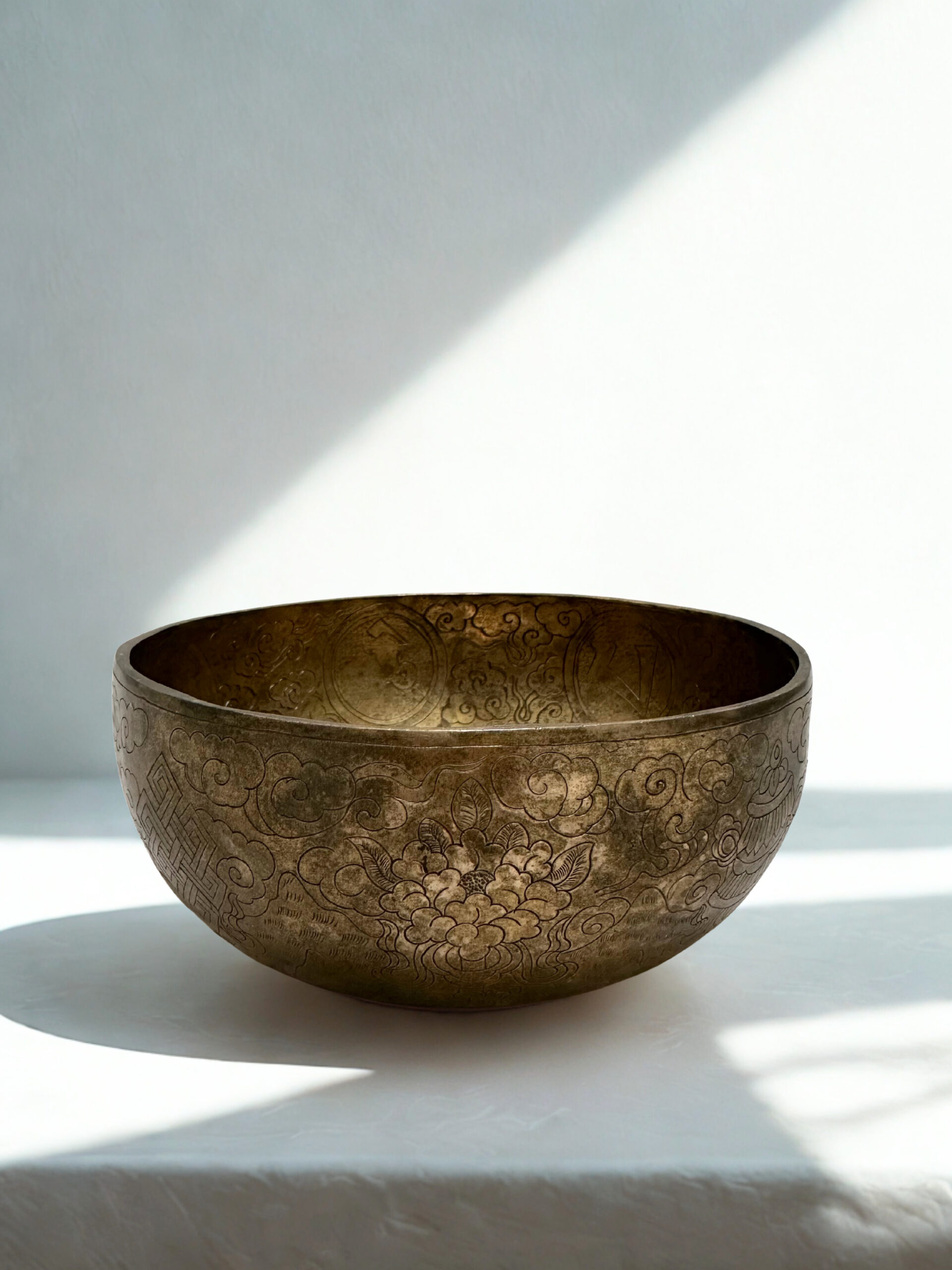 Fuld håndgraveret, håndbanket synge- og klangskål af ældre dato.